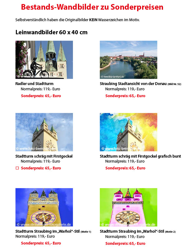 Sie suchen Bilder von Straubing? Für Wandbilder, zur Dekoration, für Ihr Zuhause, Büro, Kanzlei oder Praxis? Hier auf der Website Straubinger Fotogalerie präsentieren wir Ihnen eine Auswahl unserer Straubingmotive. Viel Vergnügen bei der Bilderbetrachtung! Wir freuen uns über Ihr Interesse! |